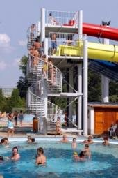 A szabadtéri élményfürdő részen 1700 m2 vízfelület, 6 fűtött vizű medence - nyakzuhanyokkal, dögönyözőkkel, pezsgőágyakkal, sodrófolyosóval - található.