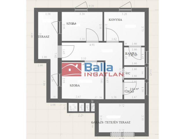 2 nagy szoba, nagy ablakos, világos konyha, kamra, fürdőszoba, külön mellékhelyiség, terasz (8 m2).
