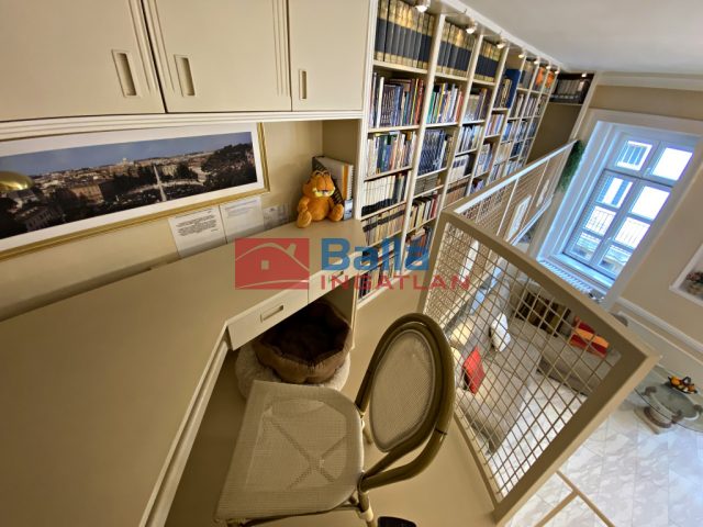 A lakásban egyedi tervek alapján készültek a beépített bútorok, ezzel is kihasználva az adottságokat, melynek köszönhetően rengeteg pakolófelület áll rendelkezésre.