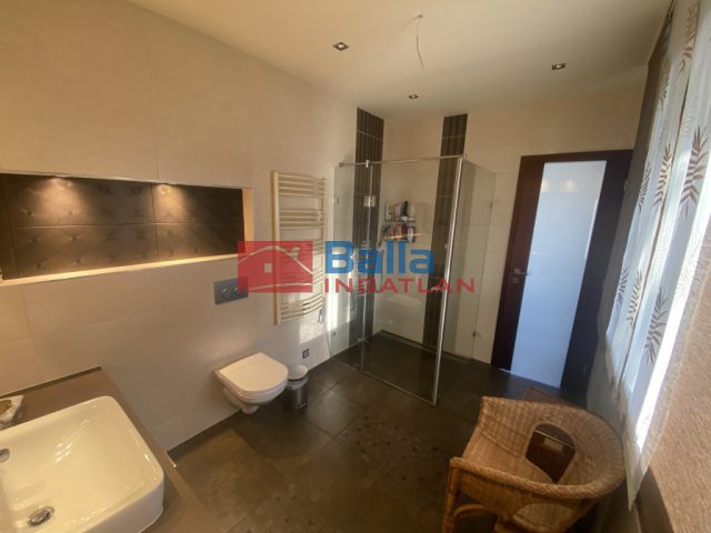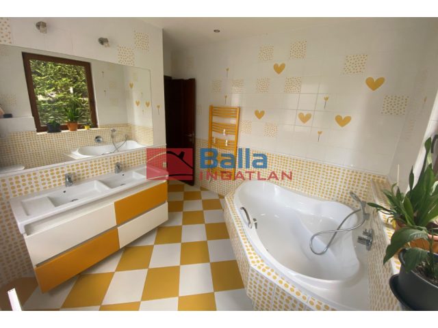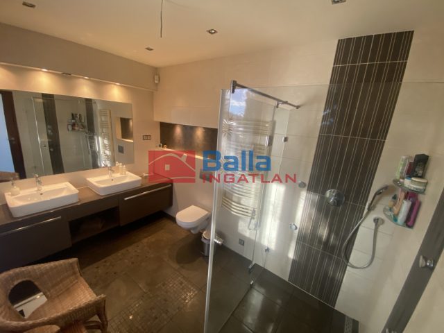 A fürdőszobákban dupla mosdó van, az egyikben kád, a másikban hidromasszázs zuhany található.