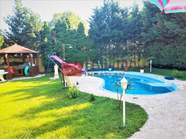 gondozott parkosított kert + 6X4m-es medence gépészettel + öntözőrendszer + fúrt kút + garázs fűtött lejáróval +