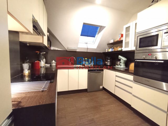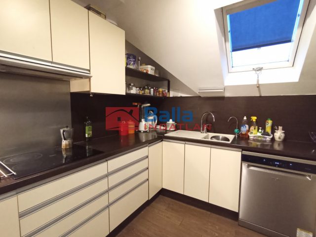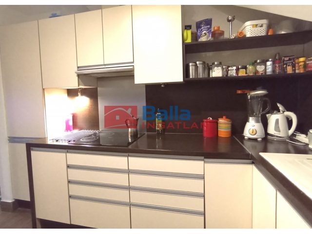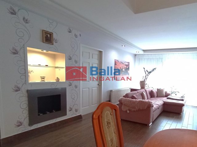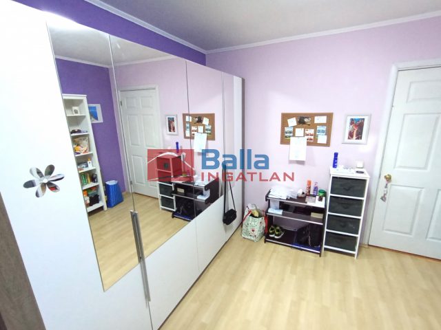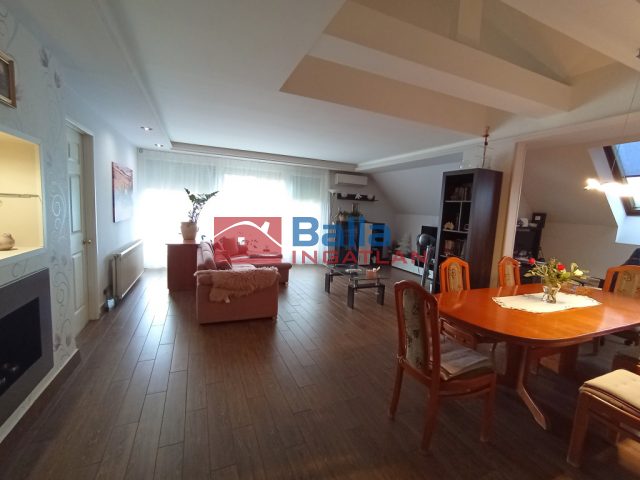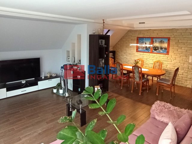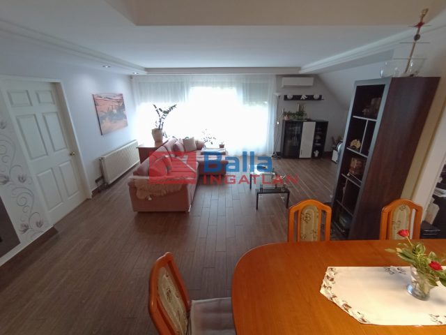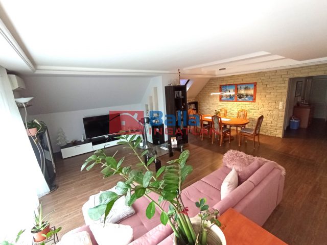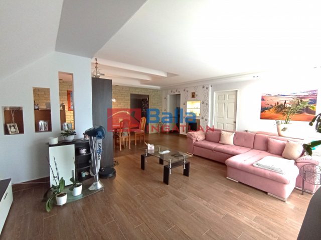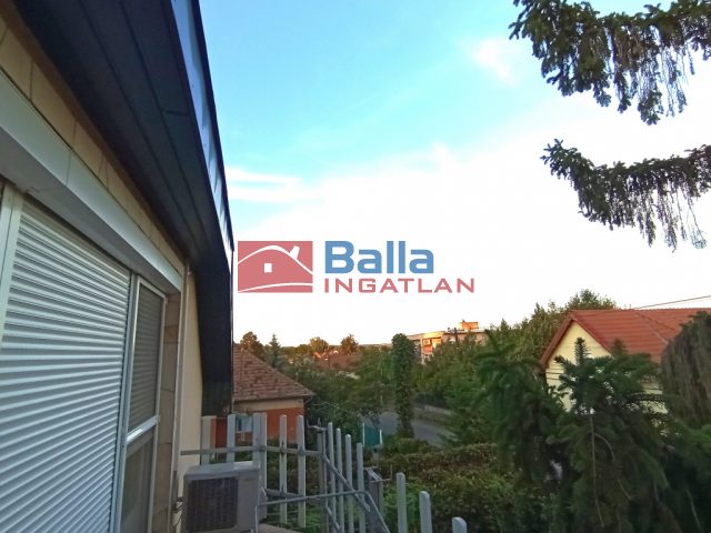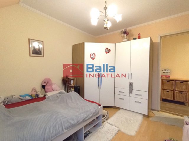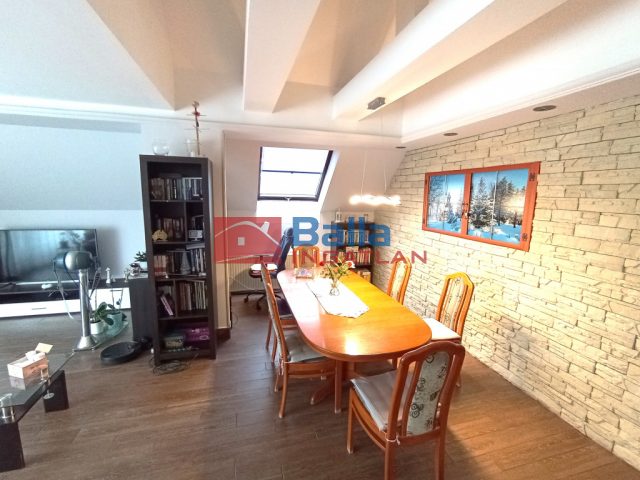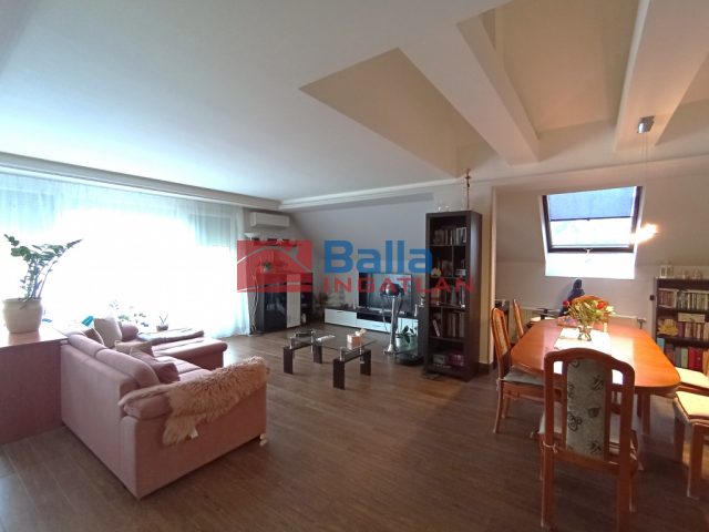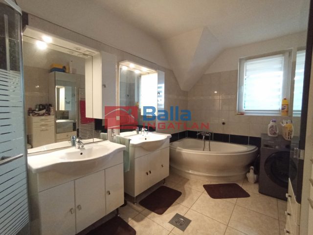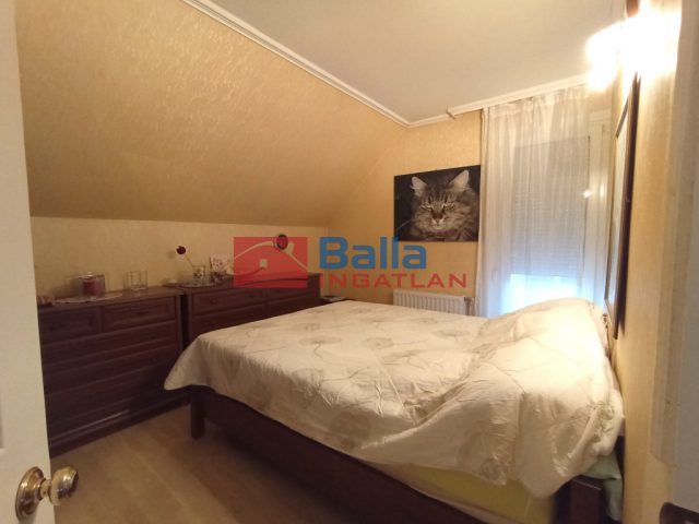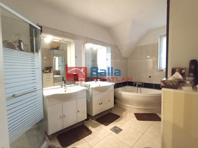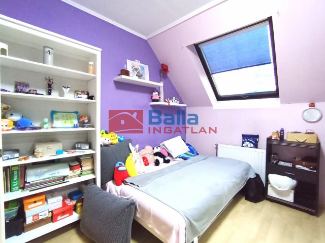 A felső szint lakása ráépítéssel készült 1995-ben, fedett teraszra érkező kényelmes lépcsőn érhető el. Különlegessége az erkélykapcsolatos nagyméretű nappali, és a dupla mosdós sarokkádas és zuhanyzós tágas, világos fürdőszoba. Jól tervezett konyha kapcsolódik a nappalihoz, a három lakószobán kívül egy gardrób és kézmosós WC található a nettó 120 nm-en. Fűtését és melegvíz ellátását kombi cirkó kazán biztosítja, hűtéséhez klíma járul hozzá.