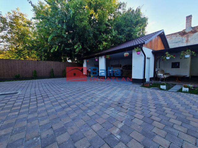 A kert nagy része térkövezett, ami azért is indokolt, mert 60 m2-es garázsként használható fedett parkolóba akár két teherautó is befér. A garázs épülete 290 cm-es belmagassággal biztosítja bármilyen gépjárműnek elegendő helyet. Az épületig végig térkövezett felületen lehet eljutni.