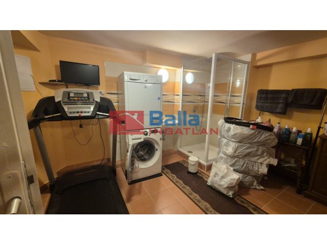 A lakáshoz tartozik egy 23 m²-es pince mosógép kiállással, mosdóval és zuhanyzóval, valamint egy garázs és egy autóbeálló, mindkettő motoros kapuval.