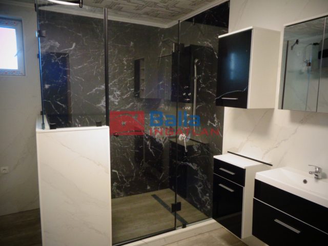 A padlót vinyl padló borítja, a fürdőszobában és konyhában szintén vinyl panel falborítással találkozunk, mely teszi a helyiséget lendületessé, érdekessé.
