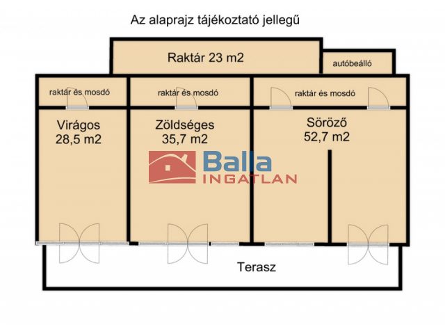 - Az épület belső tere 3 egymástól elkülönített üzlettérre és kiegészítő helyiségekre (raktár, iroda, szociális helyiségek) tagolódik.