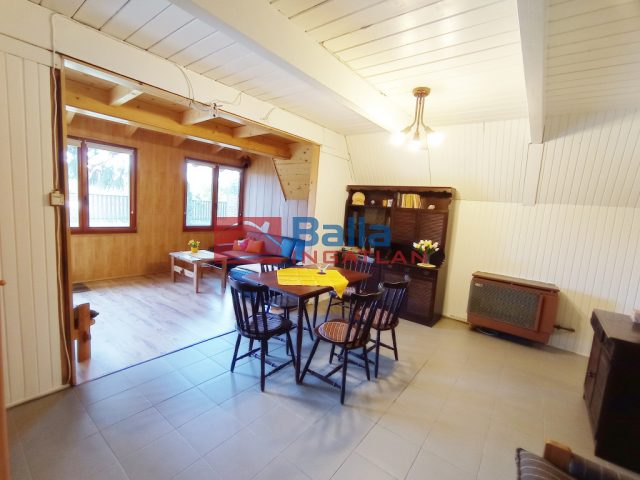 A 70 nm lakóterület földszintjén egy impozáns, 24 nm-es nappali fogadja a belépőt, ebből nyílik a kényelmes, ablakos konyha, (kétmedencés mosogatóval, gáztűzhellyel, hűtővel, lerakópulttal) és itt kapott helyet a tetőtér felé vezető lépcső is. A tetőtérben két külön nyíló szoba biztosít kényelmes pihenést. A földszinten egy kis közlekedőből jutunk be a zuhanyzós fürdőbe, és a közlekedőből léphetünk ki a nagy, fedett teraszra, innen csodás kilátás nyílik a szép, gondozott kertre.