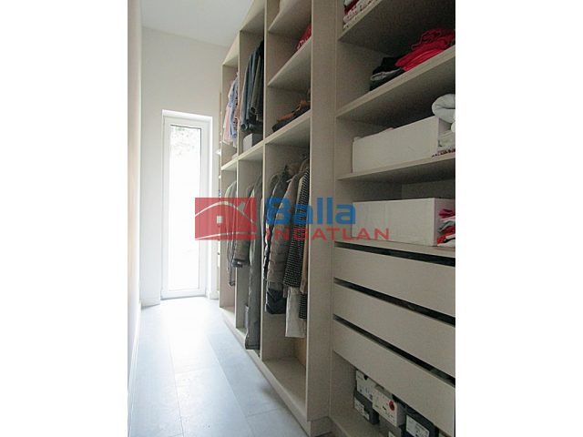 A kényelmes fogadótér egyedi gyártású előszoba bútorral ékeskedik, mely teljes összhangban van az innen nyíló gardróbszoba letisztult