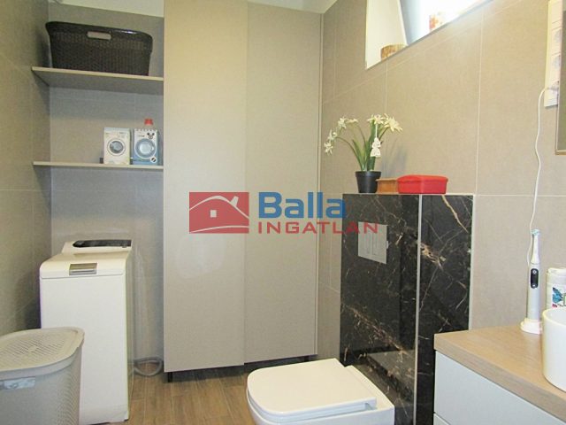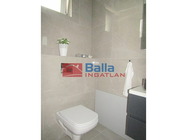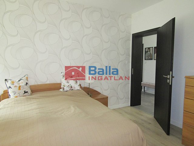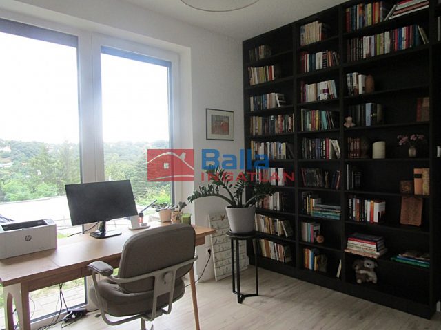 épített zuhanyzós fürdőszoba, a tágas, kádas fürdőszoba kapcsolatos hálószoba, és a jelenleg dolgozóként használt szoba, melyben a beltéri fa ajtókhoz illeszkedő hatalmas, praktikus elosztású beépített könyvespolc-rendszer biztosít rendet a könyveknek.