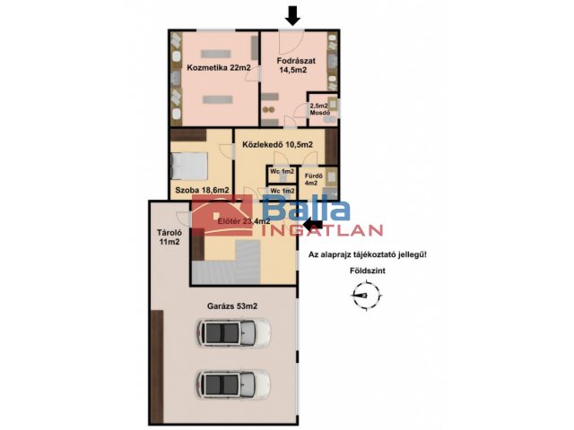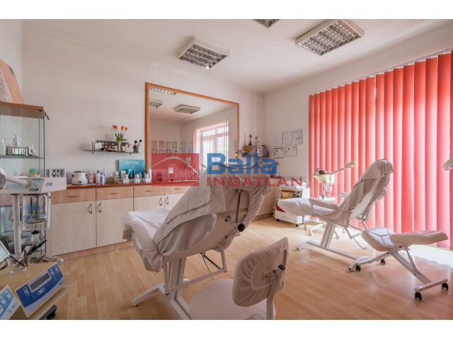 Az épület két bejárattal rendelkezik, a két egységet teljesen le lehet választani, így akár két generációs lakóházként is lehet hasznosítani. Jelenleg egy utcafronti bejáraton át jutunk a szépségszalonba, melyhez 2 nagyobb helyiség és vendégmosdó is tartozik. A földszinten ezen kívül még egy nagyobb szobát, fürdőszobát, WC-t és tárolót is találunk. A másik bejárat az udvar felől található: innen egy tágas előszobába lépünk, ahonnan kényelmes lépcső vezet a tetőtérbe. Az emeleten egy szoba, amerikai konyhás nappali és fürdőszoba lett kialakítva.