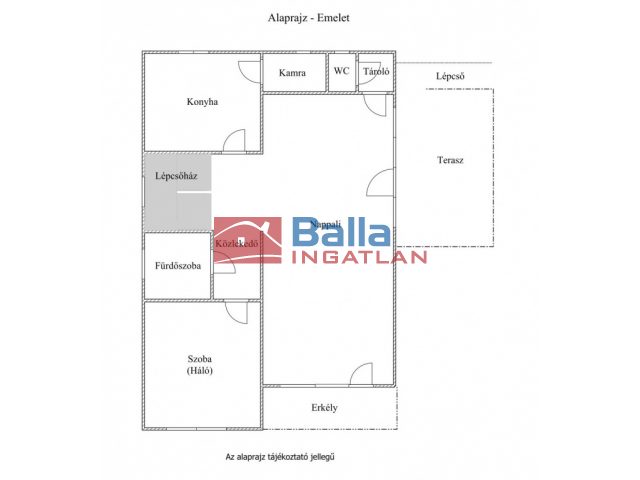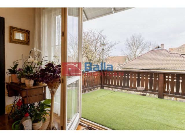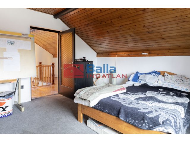 Az emeleten egy nagyon tágas (44,37 nm) és nagy ablakokkal rendelkező nappali, 1 szoba, konyha, kamra, fürdőszoba, WC, tároló (gardrób) helyiségek találhatók. A konyhában gáz főzőlap, páraelszívó és elektromos sütő került beépítésre. A nappaliból egy nyugati tájolású erkély és egy déli tájolású tágas terasz is elérhető. A teraszról lépcső vezet a kertbe, így az ingatlan akár két különálló lakrésszé alakítható, a két külön bejárat biztosított.