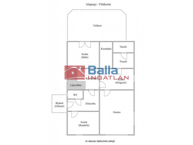 A földszinten előszoba, 3 szoba (hálószoba, dolgozó, rendelő), egy tusoló helyiség, WC, tároló, kazánház, garázs, közlekedő és télikert helyiségek kaptak helyet. A közlekedőben található a lépcső, ahonnan megközelíthetőek a további szintek.