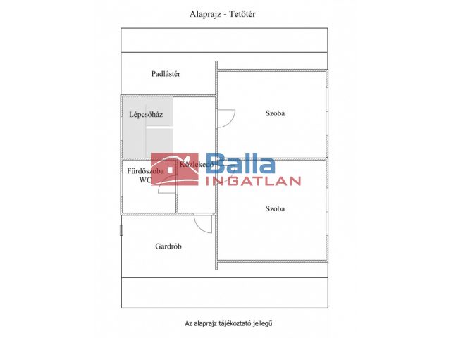 A tetőtérben egy közlekedő, 2 szoba és egy fürdőszoba került kialakításra, illetve az alaprajzon a gardrób megjelölésű helyiségek tárolásra, vagy akár kisebb dolgozó szobának is alkalmas.
