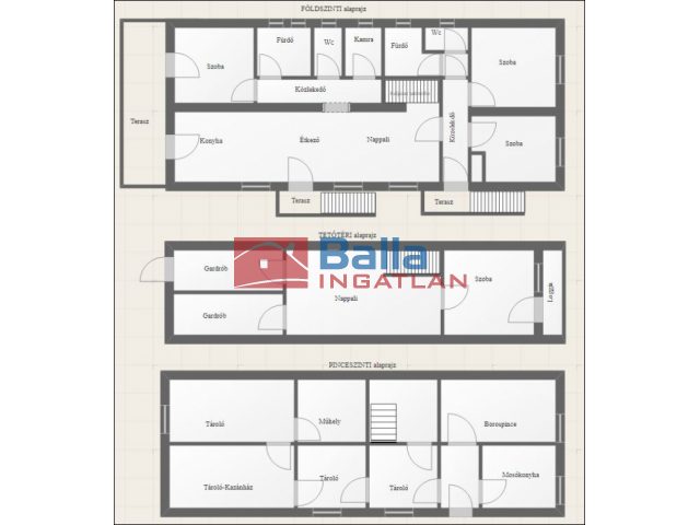• Földszint: 140 m², amely magában foglal egy 60 m²-es konyha, étkező és nappali részt, 3 szobát, két fürdőszobát, két külön WC-t, kamrát, közlekedőket.