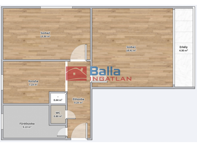 A lakás a két szobán kívül, rendelkezik egy előszobával, konyhával, fürdőszobával, külön wc-vel, és egy nagy erkéllyel. A szobák, a konyha és az előszoba, laminált padlóval, a fürdő, a wc, és az erkély pedig minőségi járólappal burkolt.