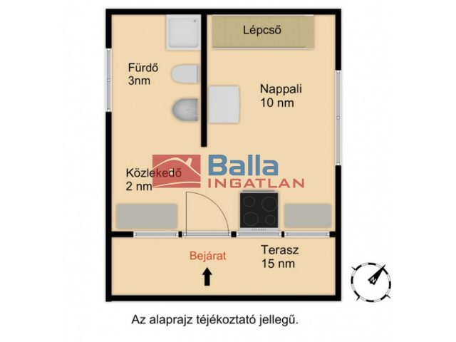 Alsószint: 15 négyzetméter (ebből 10 nm szoba, 3 nm fürdő, 2 nm közlekedő)