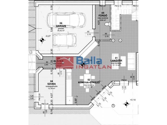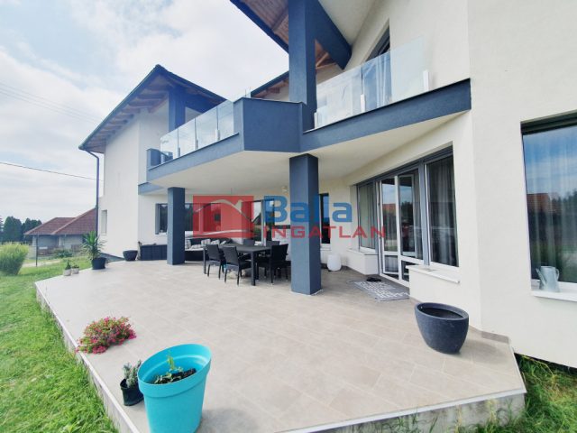 A földszinten a nappali mellett fűtött, dupla, motoros, távműködtetésű ajtóval zárt 2 autó beállásra alkalmas garázs. 300 nm-es telekterület, összességében a két szinten 48 nm terasz.