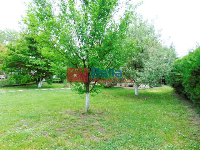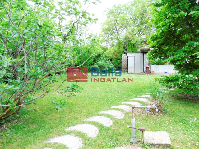 A kert gondozott, néhány gyümölcs- és díszfával, fúrt kúttal.